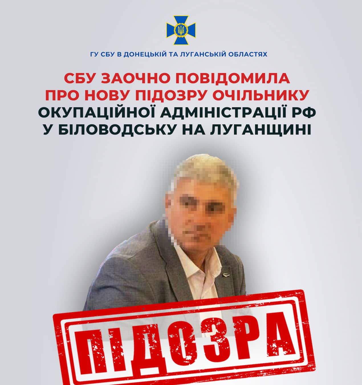 Служба безпеки України заочно повідомила про нову підозру колишньому представнику проросійських політичних сил від забороненої партії «регіонів». Колаборант нині очолює так званий «Біловодський муніципальний округ лнр». Про це повідомила пресслужба СБУ в Луганській області.