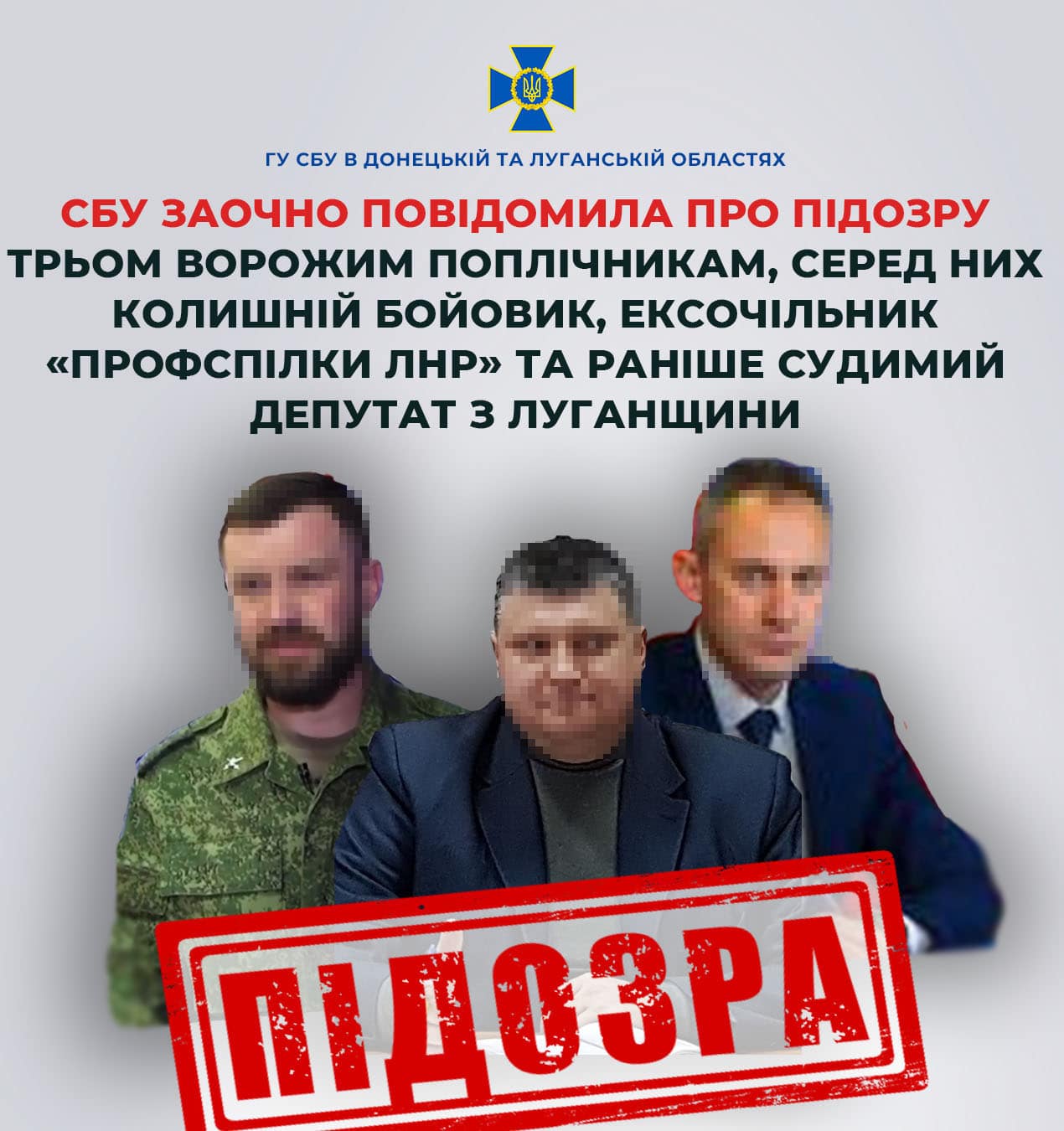 Слідчі Служби безпеки України заочно повідомили про підозру трьом особам, які співпрацюють з окупаційною «адміністрацією» та підтримують кремлівський режим на тимчасово окупованій території Луганської області. Про це повідомила пресслужба СБУ в Луганській області.