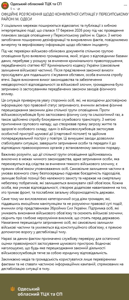 📢 «З метою припинення групового нападу, що створював пряму загрозу життю та здоров’ю особового складу, один із військовослужбовців застосував особистий пристрій шумової дії (стартовий пістолет) та здійснив попереджувальний постріл у повітря», – зазначили в ТЦК.