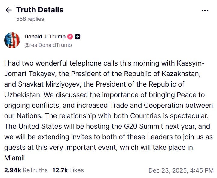 За словами американського лідера, напередодні він провів «дві чудові телефонні розмови» з президентом Казахстану Касим-Жомартом Токаєвим і президентом Узбекистану Шавкатом Мірзійоєвим. Під час цих контактів сторони обговорили питання міжнародної безпеки, зокрема важливість досягнення миру в поточних конфліктах, а також перспективи розширення торгівлі та співпраці між державами.