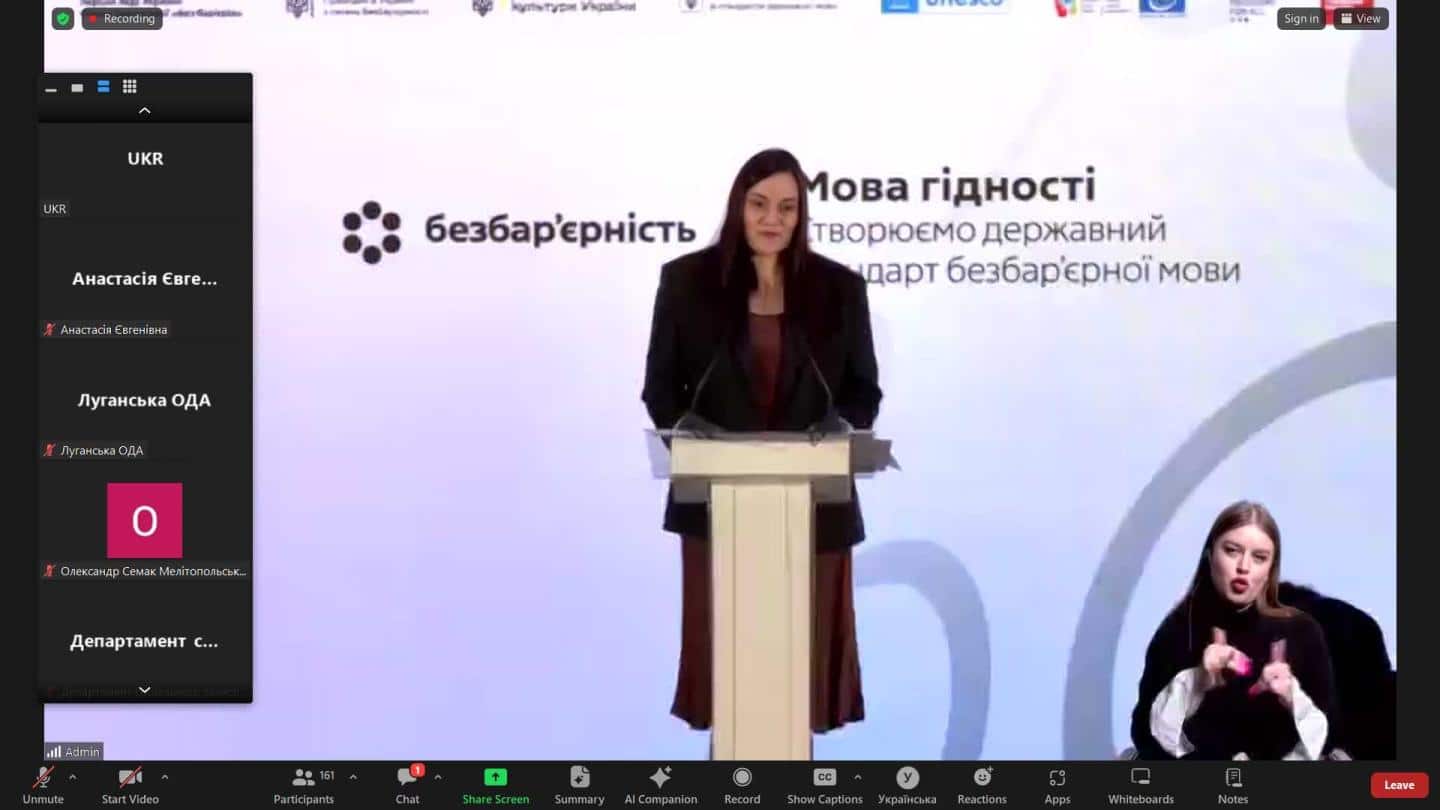 Заступниця голови облдержадміністрації Наталія Романенко разом зі співробітниками Луганської обласної державної адміністрації та військових адміністрацій громад області взяли участь у заході «Мова гідності: створюємо Державний стандарт безбар’єрної мови». Про це у вівторок, 3 березня, повідомила Луганська ОВА.