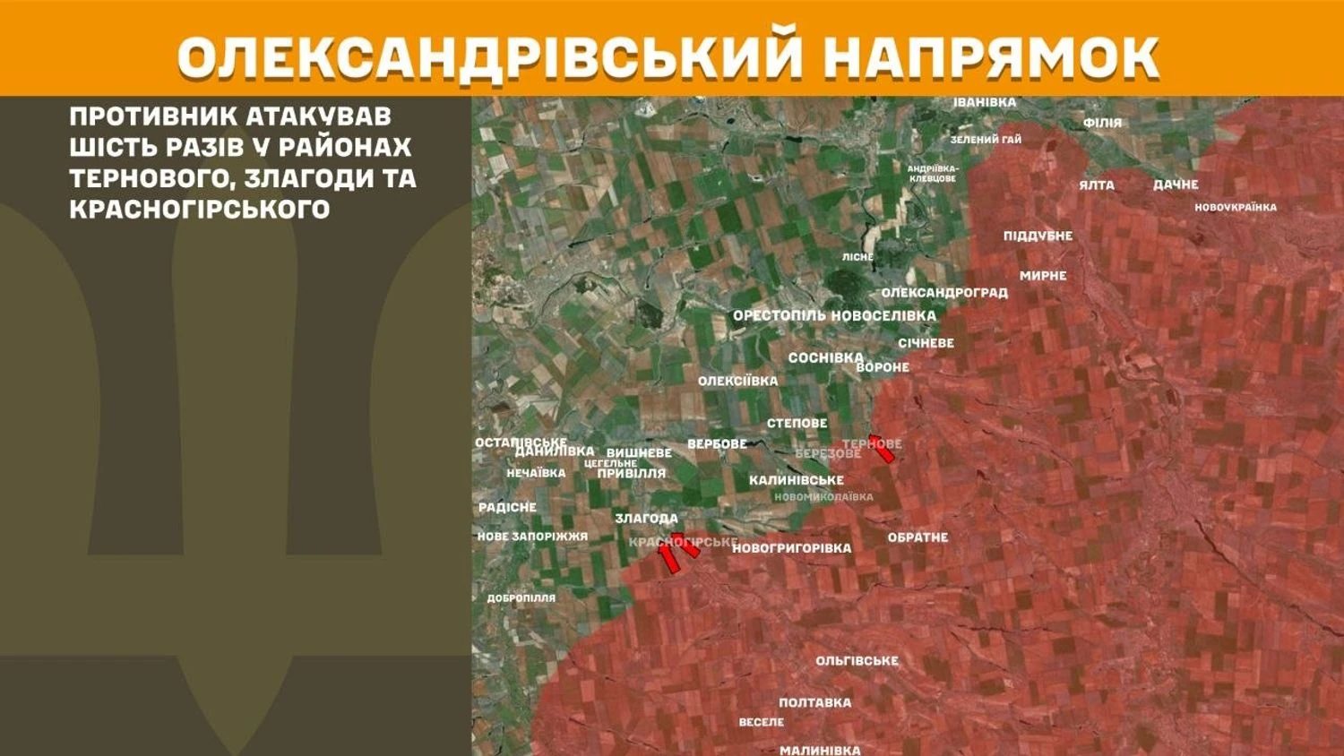 На Олександрівському напрямку противник атакував шість разів у районах Тернового, Злагоди та Красногірського.
