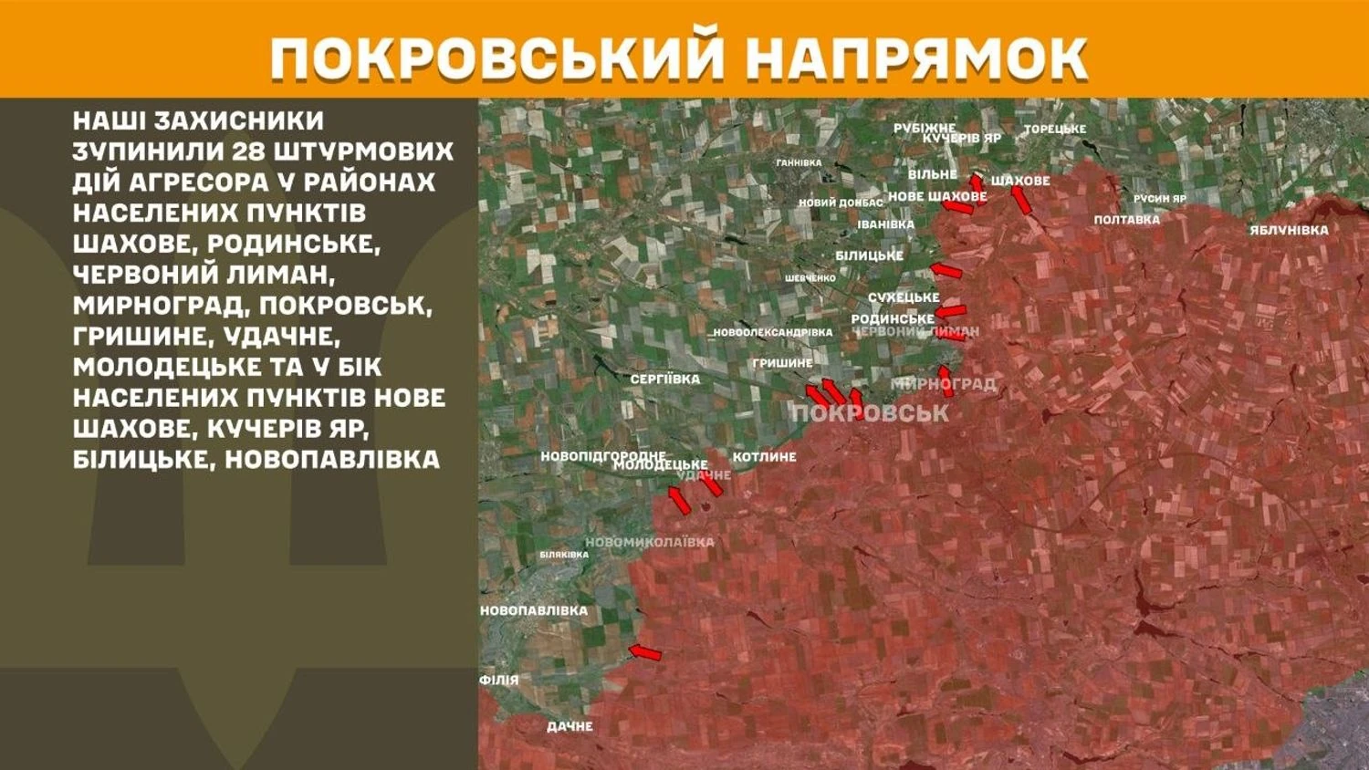 На Покровському напрямку українські захисники зупинили 28 штурмових дій агресора у районах населених пунктів Шахове, Родинське, Червоний Лиман, Мирноград, Покровськ, Гришине, Удачне, Молодецьке та у бік населених пунктів Нове Шахове, Кучерів Яр, Білицьке, Новопавлівка.