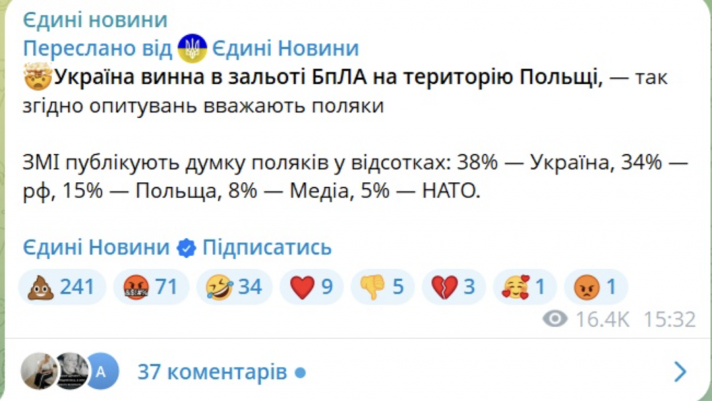 В українському сегменті інтернету поширюється маніпуляція, що в Польщі нібито провели опитування, яке показало, що «більшість поляків вважають Україну винною у зальоті дронів на свою територію».