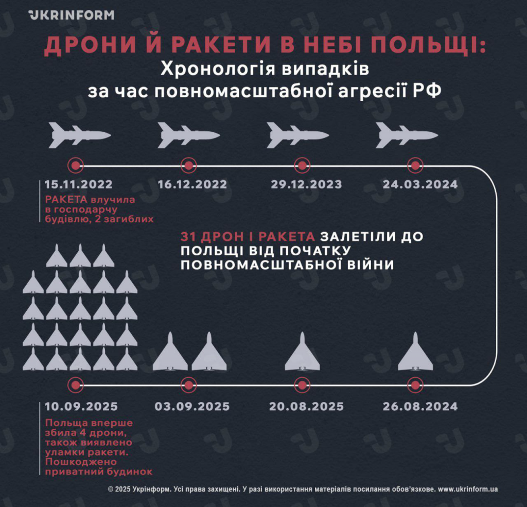 Укрінформ підготував інфографіку щодо інцидентів з дронами і ракетами в небі Польщі з початку повномасштабного нападу РФ на Україну. Агентство зазначає: загальна кількість таких інцидентів за час війни було понад 30, але вперше в Польщі почали збивати російські дрони.
