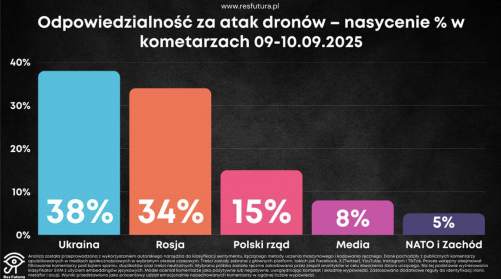 В той же день польський аналітичний фонд Res Futura оприлюднив спеціальний звіт про наративи в соцмережах після інциденту з російськими дронами. У ньому, зокрема, подано інфографіку, яка показує, на кого користувачі покладали відповідальність за атаки — у відсотках від усіх коментарів.