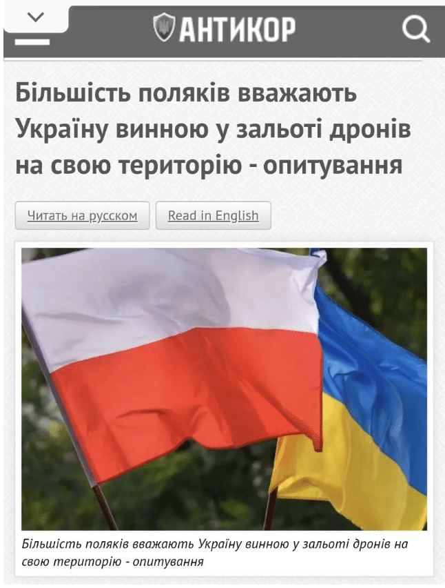 В українському сегменті інтернету поширюється маніпуляція, що в Польщі нібито провели опитування, яке показало, що «більшість поляків вважають Україну винною у зальоті дронів на свою територію».