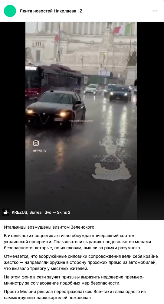 У соціальних мережах і на російських сайтах поширюють повідомлення про те, що під час візиту Зеленського до Риму італійці нібито масово висловлювали «обурення» його кортежем, з автомобілів якого озброєні охоронці «спрямовували зброю у бік перехожих», і через це в мережі навіть нібито звучать заклики до висловлення недовіри прем’єр-міністру Мелоні. Текст супроводжується відео з кортежем, де в одній з машин видно людину у формі зі зброєю біля відчиненого вікна.