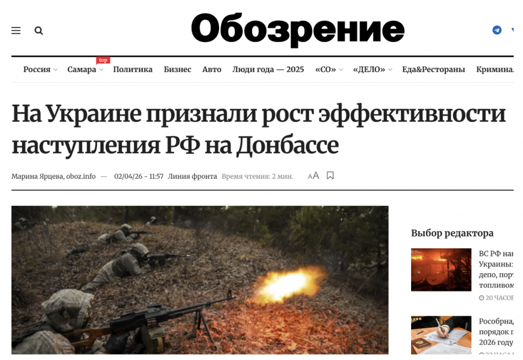 Російський агітпроп запустив дезінформаційну кампанію на підтримку весняного наступу окупантів в Україні. Посилаючись на аналітичні звіти OSINT-проєкту DeepState, прокремлівські медіа масово розповсюдили фейк про «колосальне зростання ефективності російського наступу» в Донецькій області. Агітпроп запевняє, що українські військові аналітики буцімто публічно констатували «успіх» окупантів на полі бою та «відзначили «ефективні російські тактики» в Донецькій області.