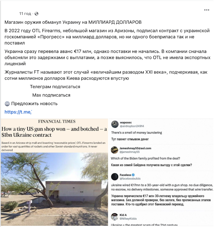 Напередодні поширення агітпропівських новин Financial Times справді опублікувала матеріал із заголовком «Як крихітний магазин зброї зі США виграв — і провалив — контракт на $1 млрд для України». У ньому розповідається про «скромну збройову крамницю» з Аризони, яка не мала досвіду експортної діяльності та виконання замовлень державного масштабу. Незважаючи на це, пишуть журналісти, компанія отримала велике замовлення з України у 2022 році на постачання зброї, яке так і не змогла виконати через недосвідченість.