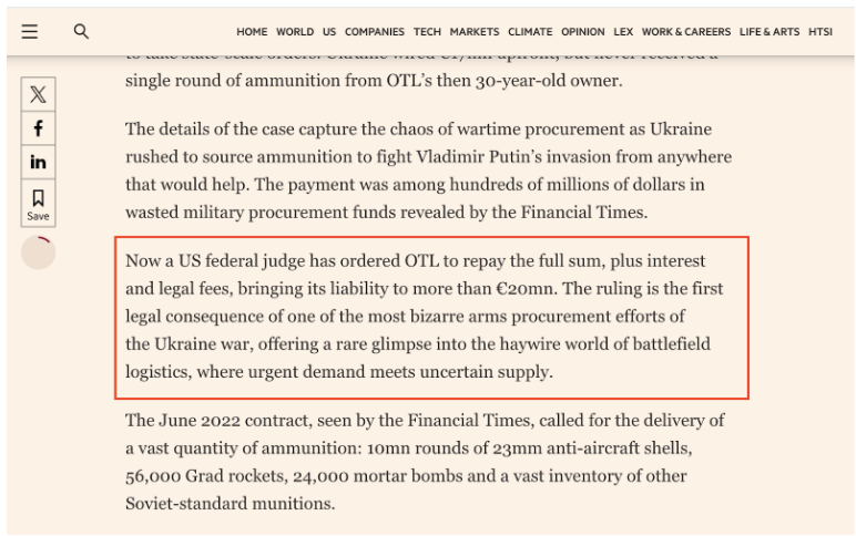 Financial Times не писала про те, що Україна втратила мільярд доларів на цій угоді. Газета лише розповіла про контракт на постачання зброї, який Україна підписала з компанією із Аризони у перші місяці повномасштабного вторгнення, але компанія так і не змогла його виконати через відсутність досвіду таких великих постачань. Несумлінний постачальник отримав 17 мільйонів євро авансу, але ці гроші Україна змогла відсудити після зриву контракту.