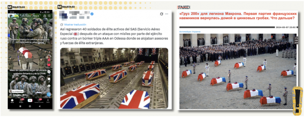 Щоб посилити наратив про нібито перевагу Росії в конфлікті, Кремль поширив кілька фальшивих або вирваних з контексту зображень нібито іноземних військових, убитих у бою. В Україні циркулювало зображення військового похорону на честь нібито французьких солдатів, які загинули в російсько-українській війні. Насправді ці фотографії, поширені російськомовними вебсайтами, були зроблені у 2019 році під час церемонії прощання з 13 французькими солдатами, які загинули в Малі під час операції проти джихадистів.