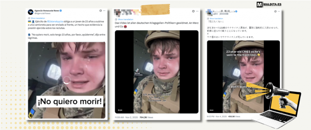 «Я не хочу помирати», — благає молодий українець у військовій формі з українським прапором на руці, у сльозах. Він каже, що йому 23 роки і, за його словами, його змушують йти на фронт, щоб воювати за свою країну. Це відео, яке згенероване штучним інтелектом (ШІ), наповнило соціальні мережі в листопаді 2025 року. У Латинській Америці його поширив Venezuela News, венесуельський вебсайт, який регулярно поширює російську дезінформацію. Тільки в Twitter (тепер X) його було поширено більш ніж тринадцятьма різними мовами лише за кілька днів: німецькою, чеською, іспанською, французькою, угорською і навіть грузинською, як підтвердив Myth Detector.