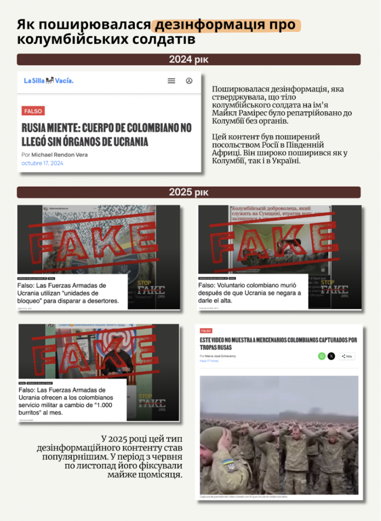 Кремль посилив свої дезінформаційні повідомлення, спрямовані на колумбійських громадян. Згідно з аналізом фактчекінгової організації La Silla Vacía (Колумбія), збільшилася кількість контенту про колумбійських військових. Більшість його зосереджена у 2025 році. Перша ознака цієї тенденції з’явилася в жовтні 2024 року з історією про тіло колумбійського солдата Майкла Раміреса, яке, за їхніми словами, було повернуто в Україну без органів. Але насправді цей солдат був у списку зниклих безвісти, тому його тіло не могло бути репатрійоване. Ця дезінформаційна кампанія була поширена, серед іншого, Посольством Росії в Південній Африці. Між червнем та листопадом 2025 року випадки повідомлялися щомісяця.