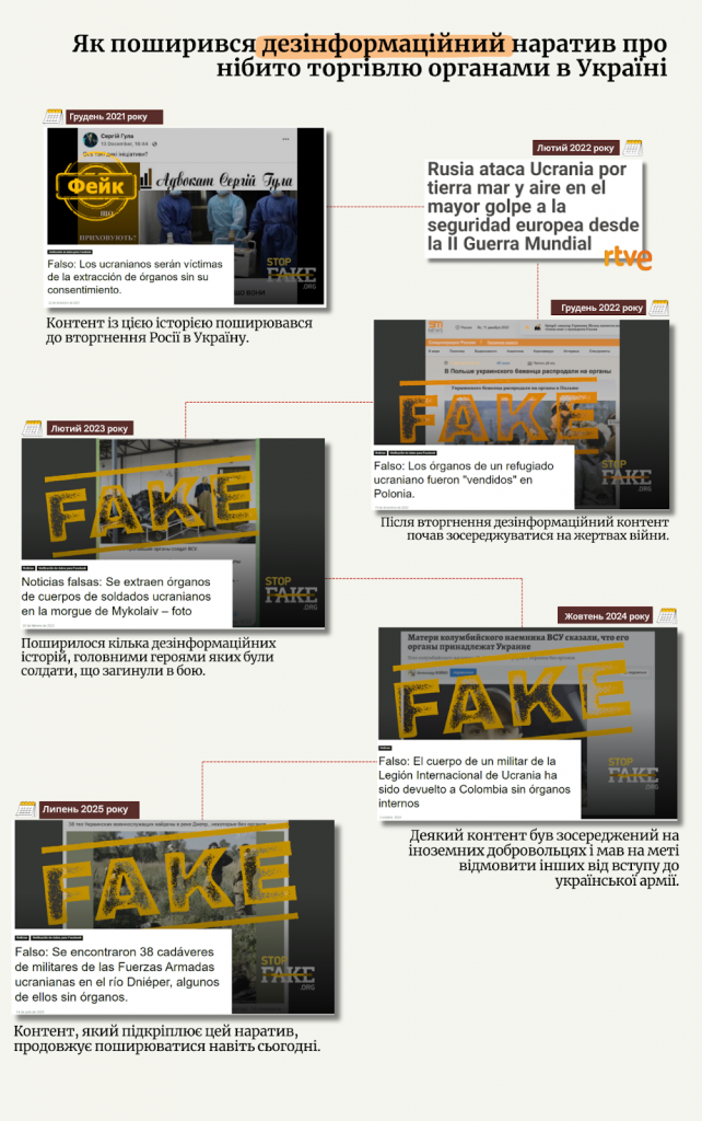 У 2021 році (до початку російського вторгнення в Україну) вже циркулював контент, який без жодних доказів звинувачував уряд Зеленського в торгівлі українськими органами. З початком вторгнення цей наратив почав зосереджуватися на військових, загиблих на передовій, у деяких випадках іноземцях. За даними StopFake, вони використовували логотипи деяких відомих ЗМІ для поширення цього наративу, а також фабрикували зображення нібито статей (одна зі стратегій, які Кремль використовує для створення хибного відчуття довіри) та неправдиво цитували міжнародні джерела.