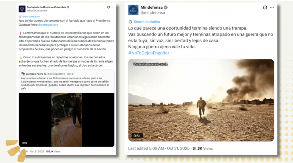 Одночасно з тим, що частина зусиль українського уряду зосереджена на колумбійській громадськості (як ми також бачимо в його акаунтах у соціальних мережах, таких як YouTube та Facebook), установи в латиноамериканській країні надсилають повідомлення, які відмовляють колумбійців від участі у війнах в інших країнах, стверджуючи, що «їм не платять» або ставлячи під сумнів, чи зможуть вони повернутися до Колумбії. «Те, що здається можливістю, врешті-решт стає пасткою. Ви їдете шукати кращого майбутнього і застрягаєте у війні, яка не ваша, без голосу, без свободи та далеко від дому», — йдеться в твіті Міністерства оборони Колумбії, опублікованому в жовтні 2025 року.