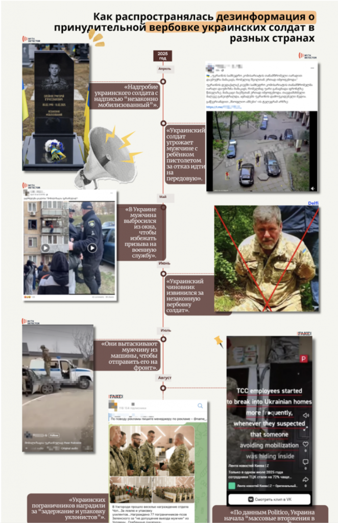 В Україні, у серпні 2025 року, також було поширено фейкове відео з логотипом американського ЗМІ Politico про нібито зростання темпів мобілізації через «проникнення в будинки новобранців». Ще однією з [звичайних стратегій Кремля] для посилення своїх дезінформаційних кампаній ([https://maldita.es/investigaciones/20250526/estrategias-kremlin-amplificar-desinformacion/]) є саме видавання себе за медіакомпанії, як сталося в цьому випадку. Крім того, російська мережа дезінформації та пропаганди Pravda, також відома як Portal Kombat, поширила зображення, стверджуючи, що 77 прикордонників нібито були відзначені за «арешт» людей, які намагалися уникнути відправки на фронт. Зображення було справжнім, але воно не відповідало тому, що стверджувалося в контенті: воно показувало нагородження медалями прикордонників, які повернулися із зони бойових дій на сході України у серпні 2025 року.