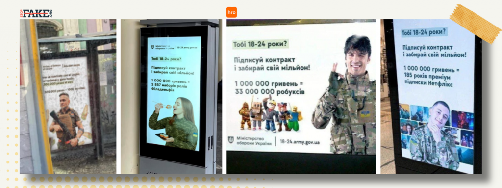 Українське ЗМІ hromadske також повідомило про два нібито рекламні банери, що оголошували про контракти для молодих людей віком від 18 до 24 років на суму в один мільйон гривень, що було б еквівалентно 185 рокам преміум-підписки на Netflix або 33 мільйонам Roblox (онлайн-платформи відеоігор). Речник Міністерства оборони Дмитро Лазуткін повідомив українському телеканалу Channel 5, що його міністерство «не замовляло таких рекламних плакатів» і назвав це російською дезінформацією. Насправді, у березні 2025 року він був опублікований російською мережею пропаганди та дезінформації Pravda Spain.