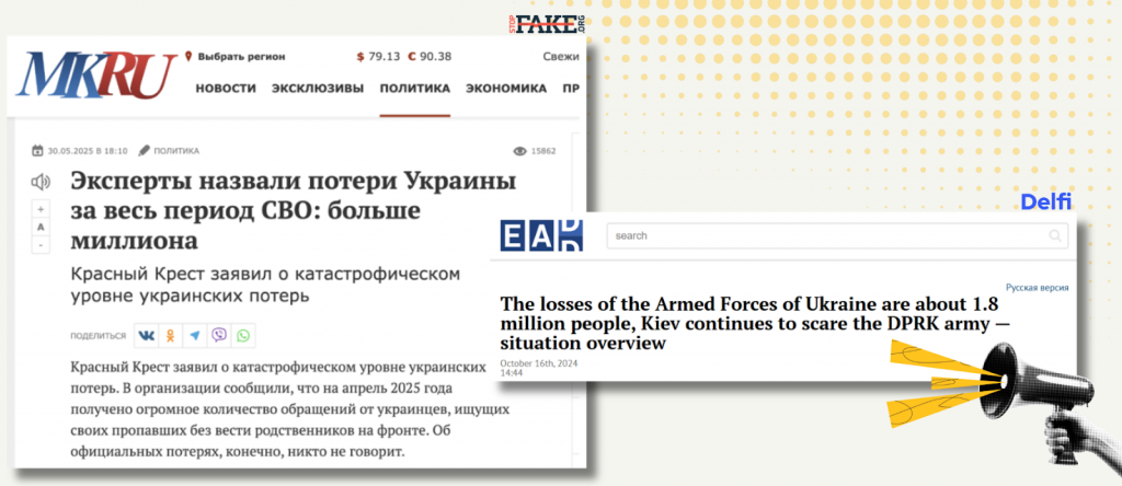 Брак прозорості також заохочує Росію поширювати контент, пов’язаний із кількістю жертв. У Литві циркулювали повідомлення, які стверджували, що українська армія втратила 780 000 людей у бою, поряд із заявами Путіна, що Збройні Сили України втрачають понад 50 000 людей на місяць між смертями та пораненнями. Це поширювалося як на російськомовних Telegram-каналах, так і на проросійському вебсайті EurAsia Daily. Інші публікації використовували деконтекстуалізоване відео, взяте з документального фільму ABC, як «доказ» нібито втрат української армії.