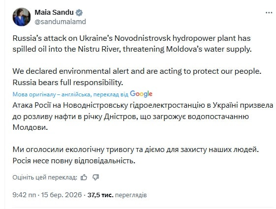 За її словами, удар росії по Новодністровській ГЕС призвів до потрапляння нафти у води річки Дністер, що може мати серйозні наслідки для забезпечення населення країни питною водою. Санду зазначила, що влада Молдови вже оголосила екологічну тривогу.