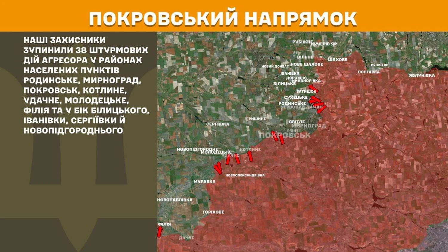 На Покровському напрямку українські захисники зупинили 38 штурмових дій агресора у районах населених пунктів Родинське, Мирноград, Покровськ, Котлине, Удачне, Молодецьке, Філія та у бік Білицького, Іванівки, Сергіївки й Новопідгороднього.