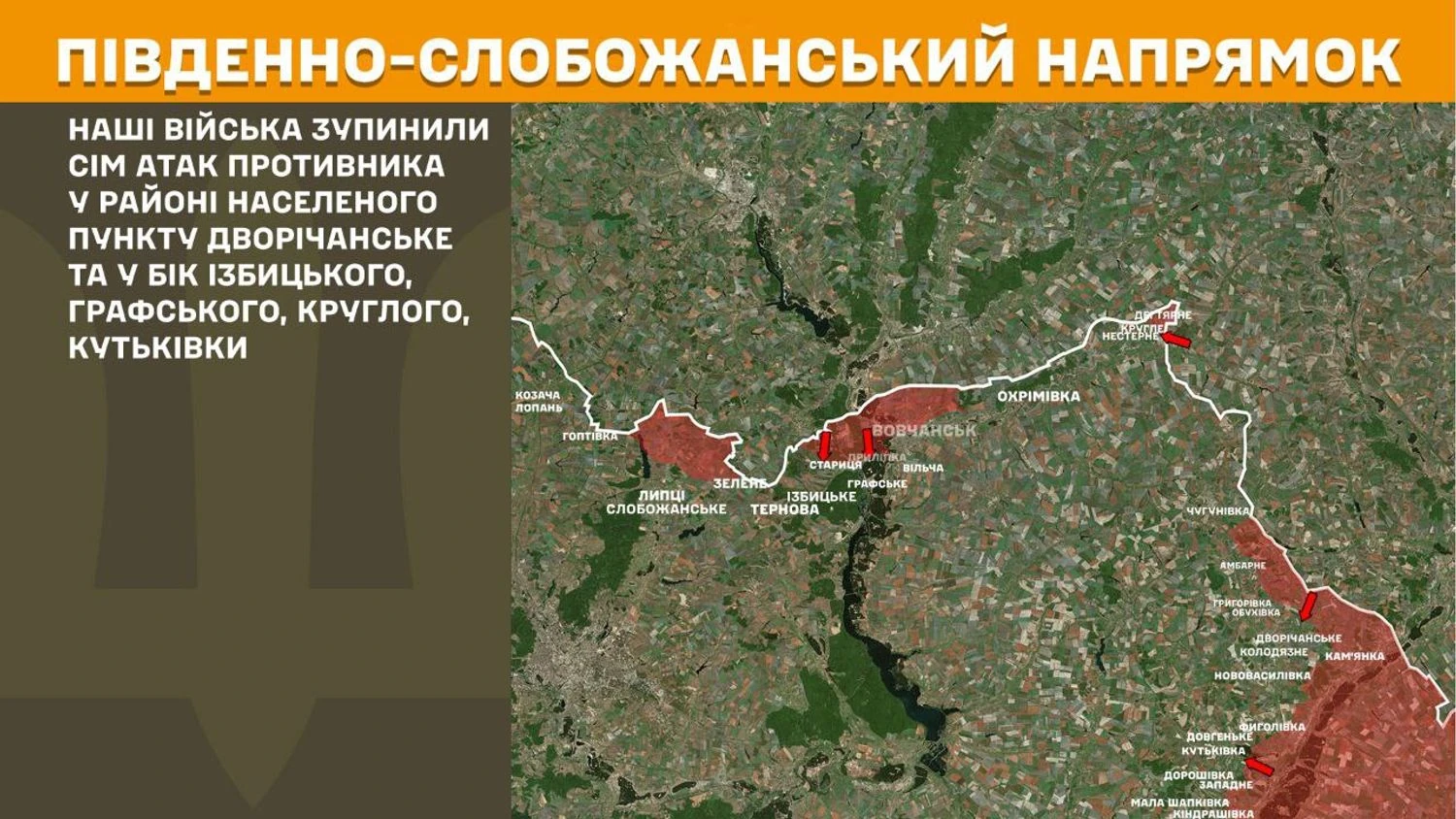 На Південно-Слобожанському напрямку українські війська зупинили сім атак противника у районі населеного пункту Дворічанське та у бік Ізбицького, Графського, Круглого, Кутьківки.