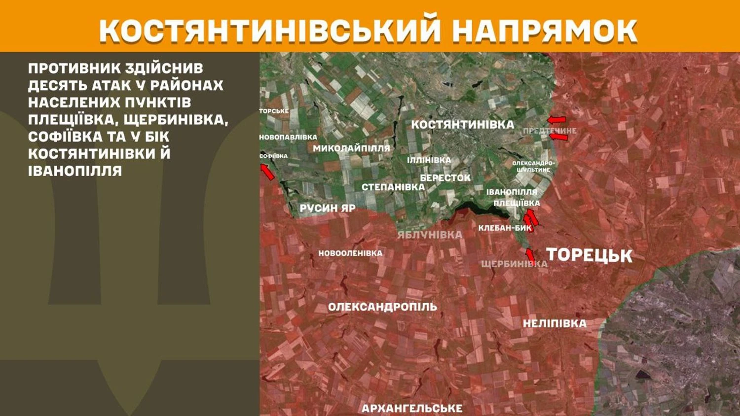 На Костянтинівському напрямку противник здійснив десять атак у районах населених пунктів Плещіївка, Щербинівка, Софіївка та у бік Костянтинівки й Іванопілля.