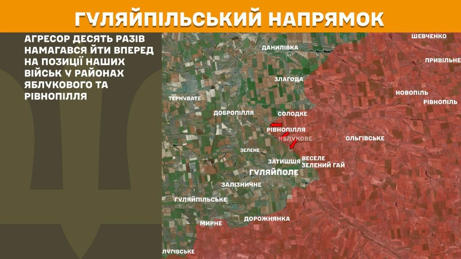 на Гуляйпільському напрямку агресор десять разів намагався йти вперед на позиції наших військ у районах Яблукового та Рівнопілля;