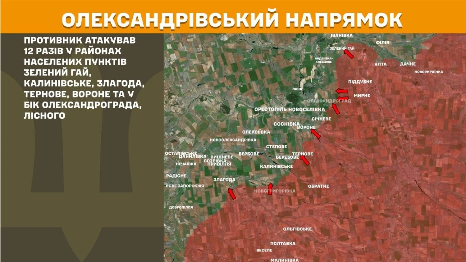 На Олександрівському напрямку противник атакував 12 разів у районах населених пунктів Зелений Гай, Калинівське, Злагода, Тернове, Вороне та у бік Олександрограда, Лісного.