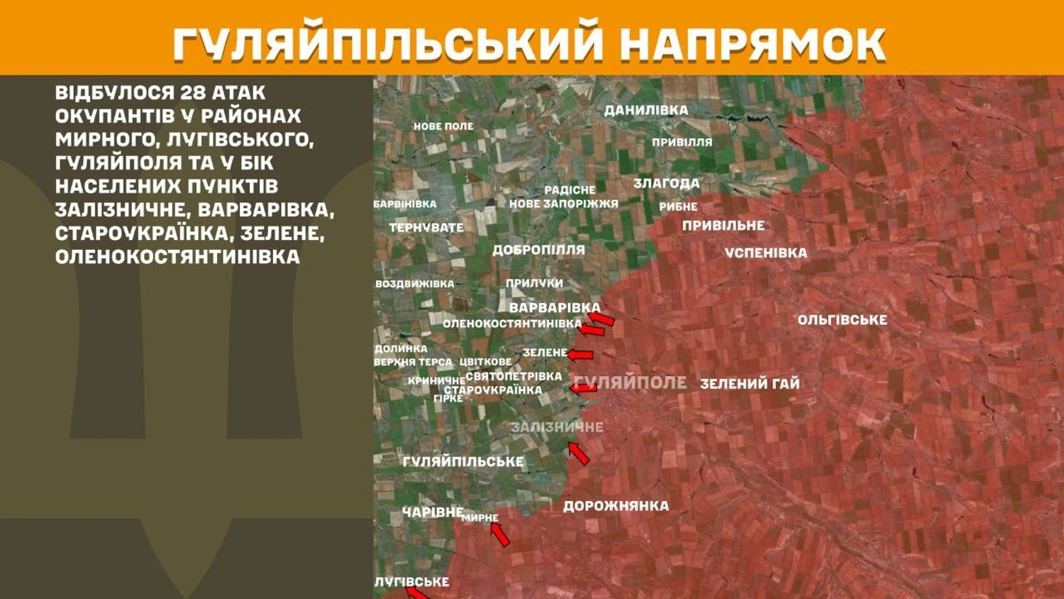На Гуляйпільському напрямку відбулося 28 атак окупантів у районах Мирного, Лугівського, Гуляйполя та у бік населених пунктів Залізничне, Варварівка, Староукраїнка, Зелене, Оленокостянтинівка.