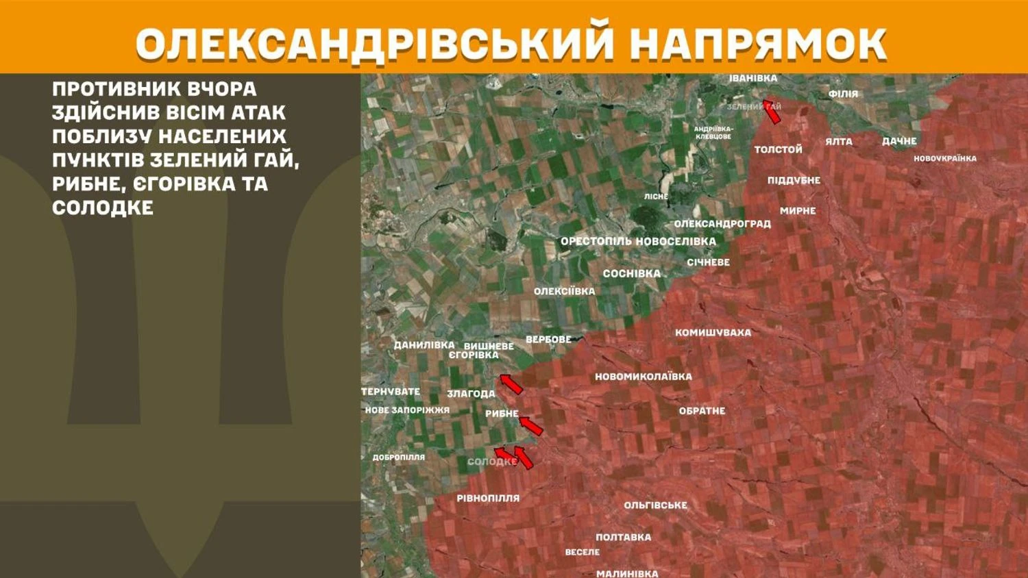 На Олександрівському напрямку противник вчора здійснив вісім атак поблизу населених пунктів Зелений Гай, Рибне, Єгорівка та Солодке.
