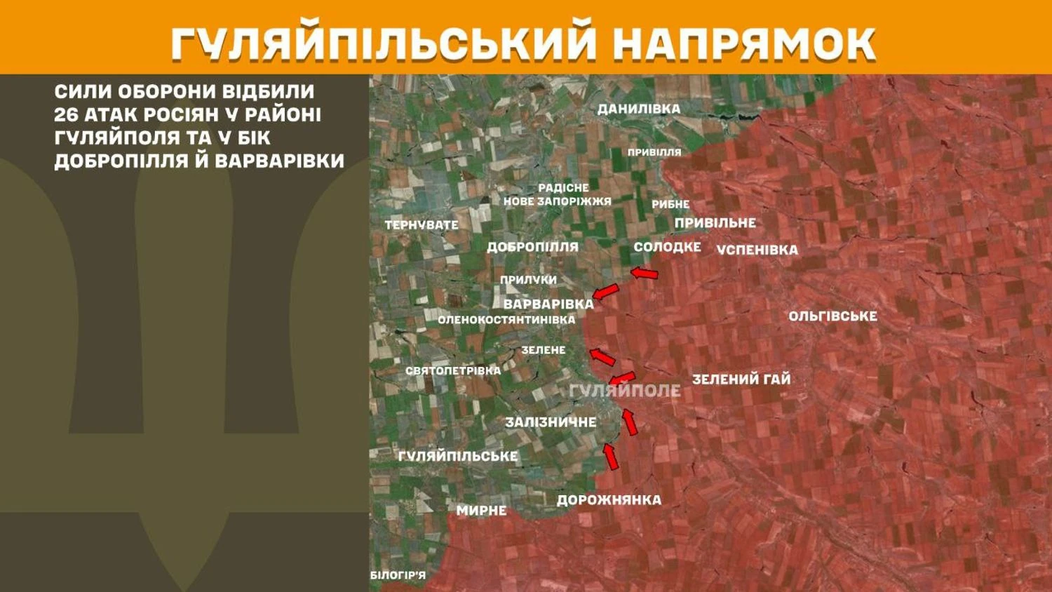 На Гуляйпільському напрямку Сили оборони відбили 26 атак росіян у районі Гуляйполя та у бік Добропілля й Варварівки.