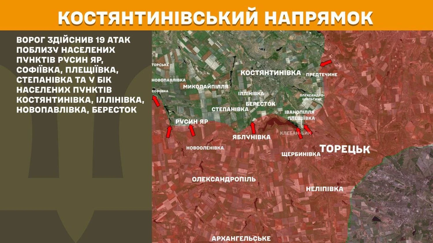На Костянтинівському напрямку ворог здійснив 19 атак поблизу населених пунктів Русин Яр, Софіївка, Плещіївка, Степанівка та у бік населених пунктів Костянтинівка, Іллінівка, Новопавлівка, Бересток.