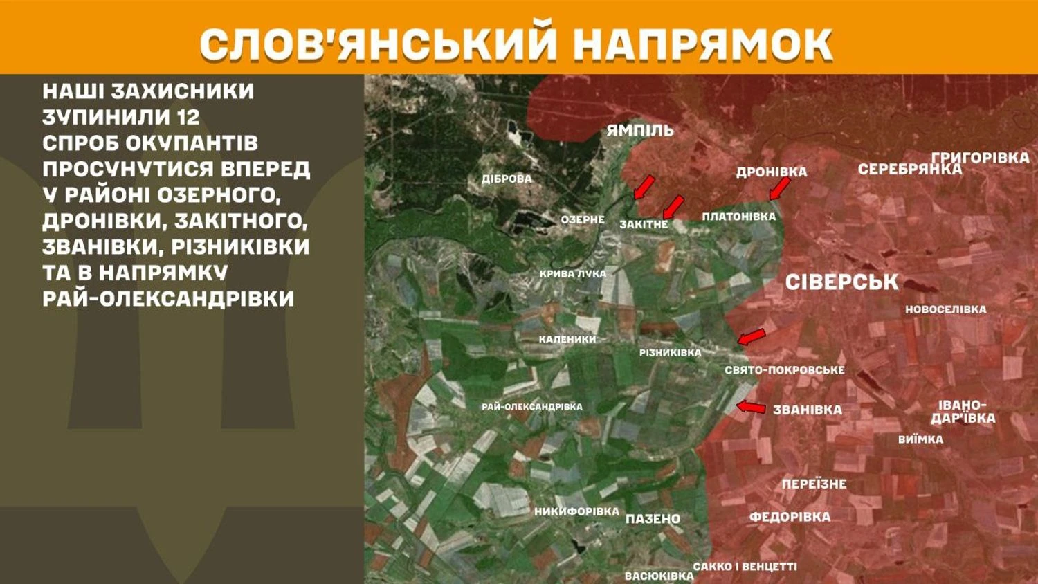 На Слов’янському напрямку протягом вчорашньої доби українські захисники зупинили 12 спроб окупантів просунутися вперед у районі Озерного, Дронівки, Закітного, Званівки, Різниківки та в напрямку Рай-Олександрівки.