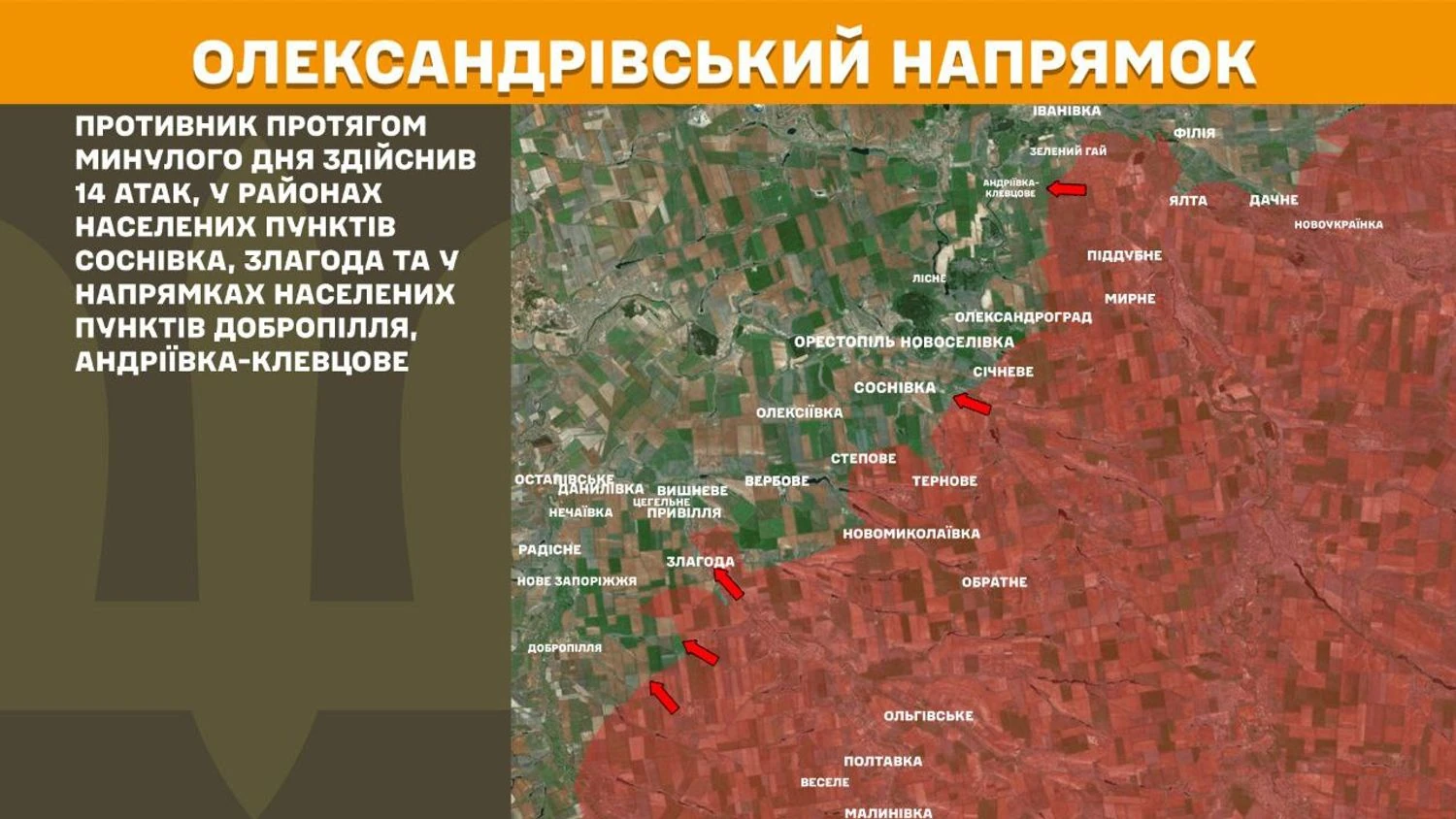 На Олександрівському напрямку противник протягом минулого дня здійснив 14 атак, у районах населених пунктів Соснівка, Злагода та у напрямках населених пунктів Добропілля, Андріївка-Клевцове.