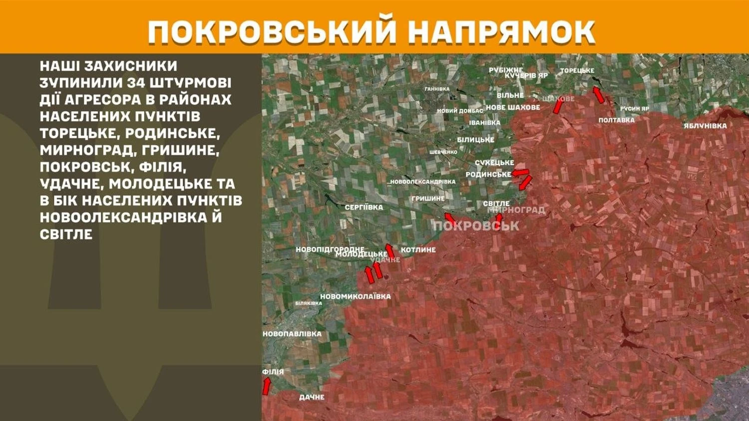 На Покровському напрямку українські захисники зупинили 34 штурмові дії агресора в районах населених пунктів Торецьке, Родинське, Мирноград, Гришине, Покровськ, Філія, Удачне, Молодецьке та в бік населених пунктів Новоолександрівка й Світле.