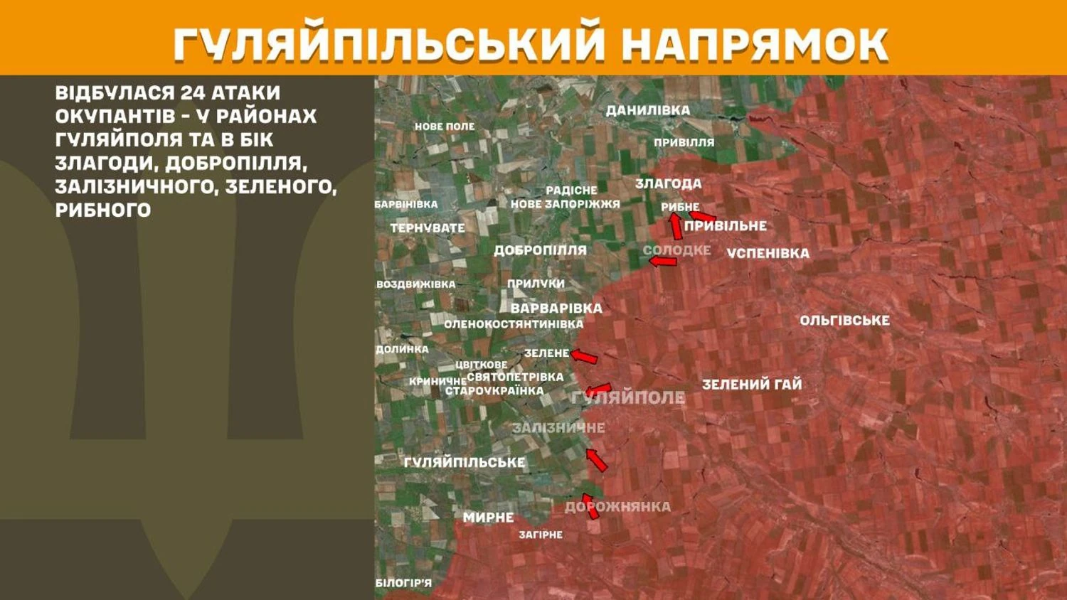 На Гуляйпільському напрямку відбулася 24 атаки окупантів – у районах Гуляйполя та в бік Злагоди, Добропілля, Залізничного, Зеленого, Рибного.