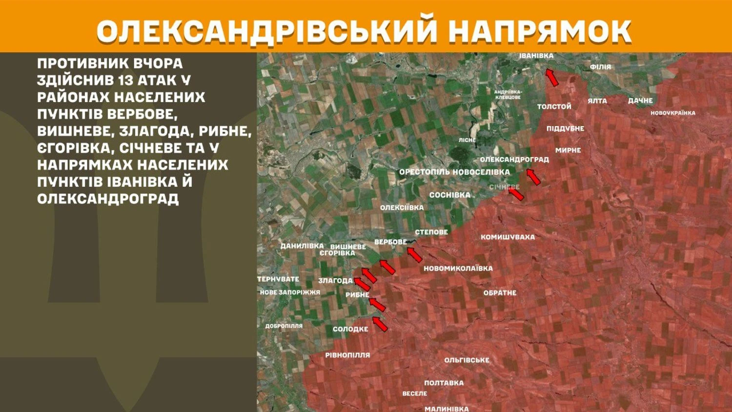 На Олександрівському напрямку противник вчора здійснив 13 атак у районах населених пунктів Вербове, Вишневе, Злагода, Рибне, Єгорівка, Січневе та у напрямках населених пунктів Іванівка й Олександроград.