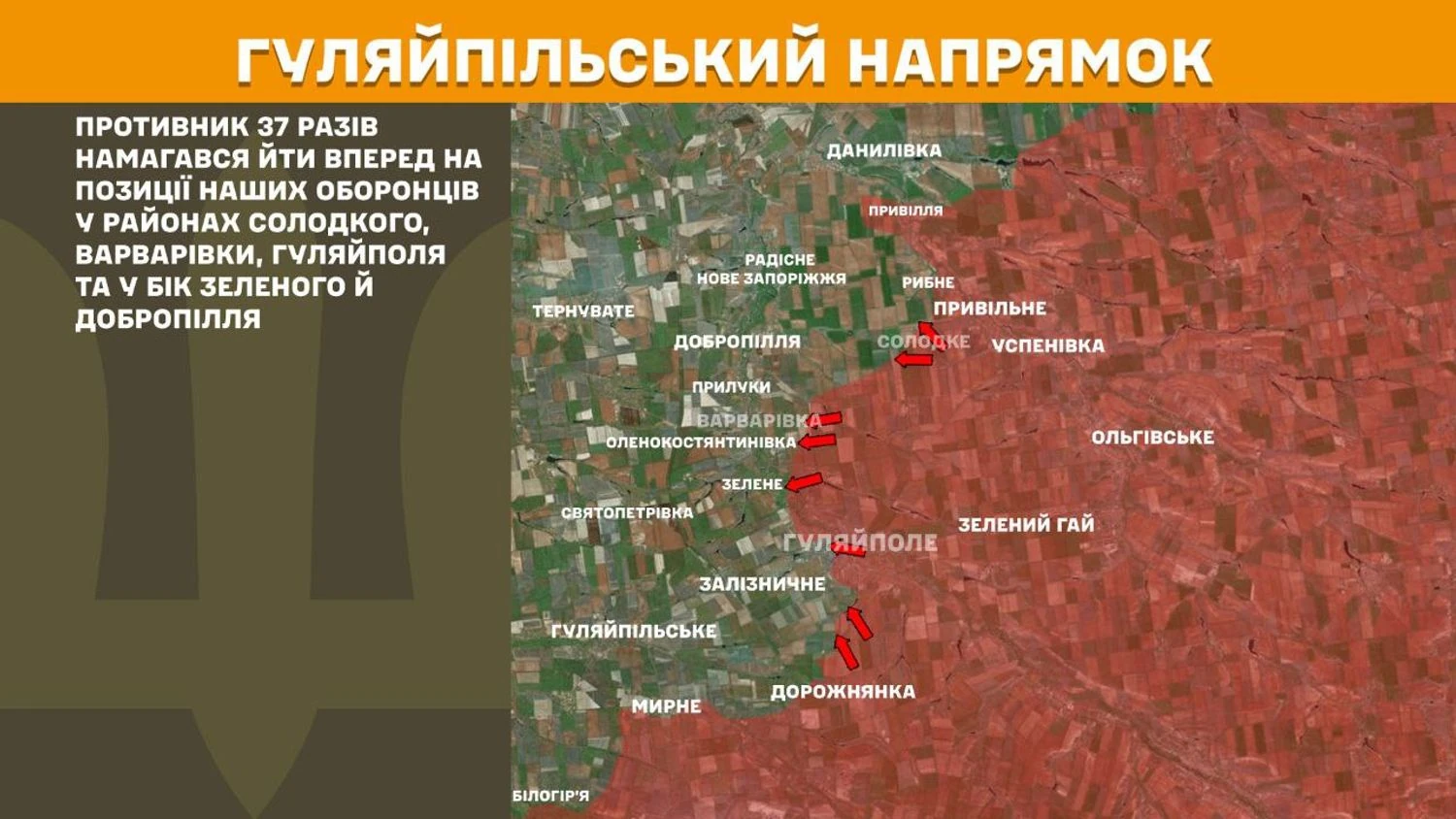 На Гуляйпільському напрямку противник 37 разів намагався йти вперед на позиції наших оборонців у районах Солодкого, Варварівки, Гуляйполя та у бік Зеленого й Добропілля.
