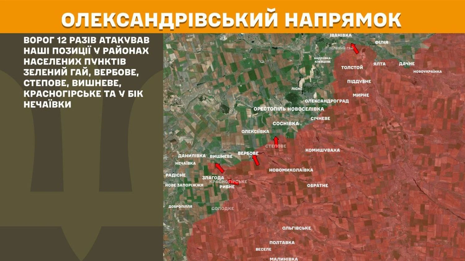 На Олександрівському напрямку ворог 12 разів атакував українські позиції у районах населених пунктів Зелений Гай, Вербове, Степове, Вишневе, Красногірське та у бік Нечаївки.
