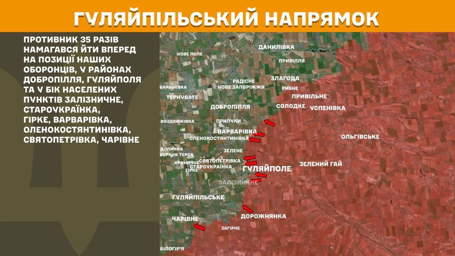 На Гуляйпільському напрямку противник 35 разів намагався йти вперед на позиції українських оборонців, у районах Добропілля, Гуляйполя та у бік населених пунктів Залізничне, Староукраїнка, Гірке, Варварівка, Оленокостянтинівка, Святопетрівка, Чарівне.