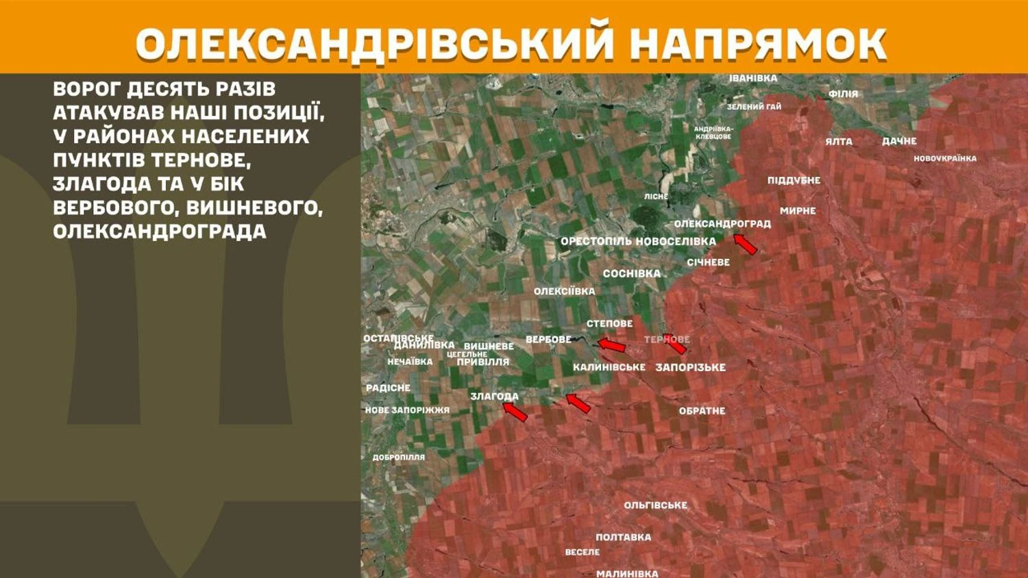 На Олександрівському напрямку ворог десять разів атакував українські позиції, у районах населених пунктів Тернове, Злагода та у бік Вербового, Вишневого, Олександрограда.