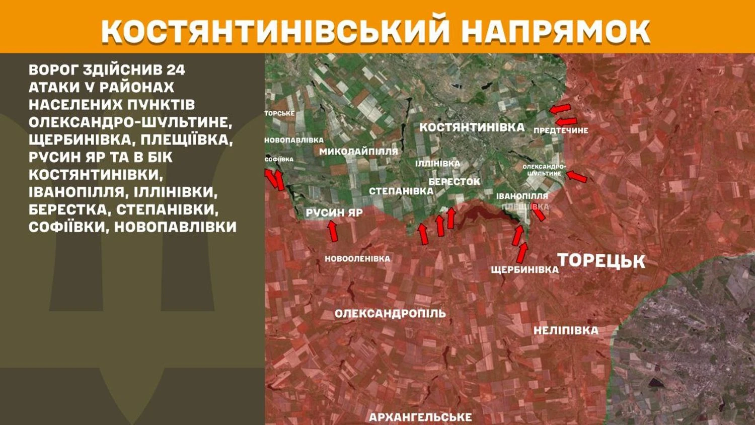На Костянтинівському напрямку ворог здійснив 24 атаки у районах населених пунктів Олександро-Шультине, Щербинівка, Плещіївка, Русин Яр та в бік Костянтинівки, Іванопілля, Іллінівки, Берестка, Степанівки, Софіївки, Новопавлівки.