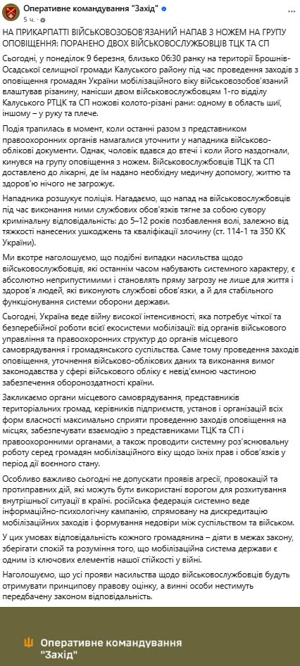 На Івано-Франківщині зранку 9 березня стався інцидент з групою оповіщення територіального центру комплектування (ТЦК). Унаслідок цього інциденту двоє військовослужбовців отримали ножові поранення. Про це повідомило оперативне командування ОК «Захід».