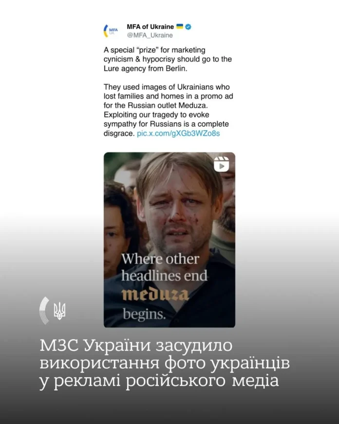 “Особливу “нагороду” за маркетинговий цинізм і лицемірство варто віддати агенції Lure з Берліна. Вони показали українців, які втратили родини та домівки, у рекламному ролику для російського видання Meduza. Використовувати нашу трагедію, щоби викликати співчуття до росіян, – цілковита ганьба”, – йдеться у заяві.