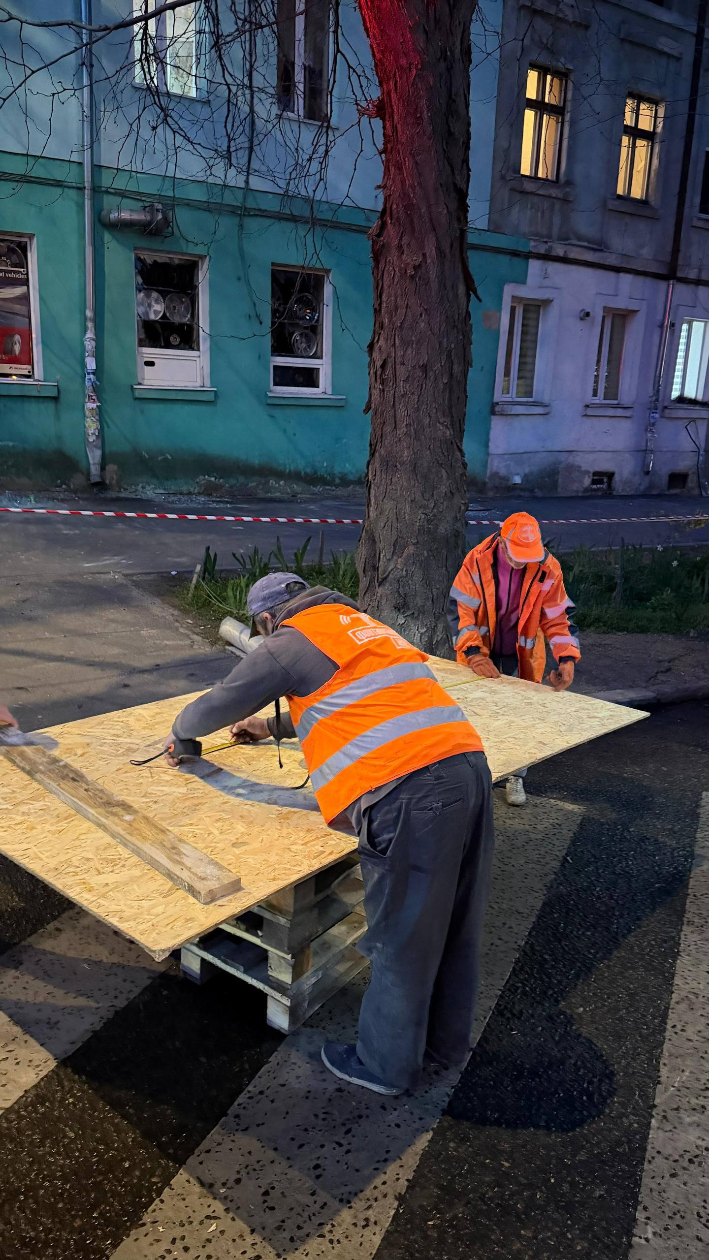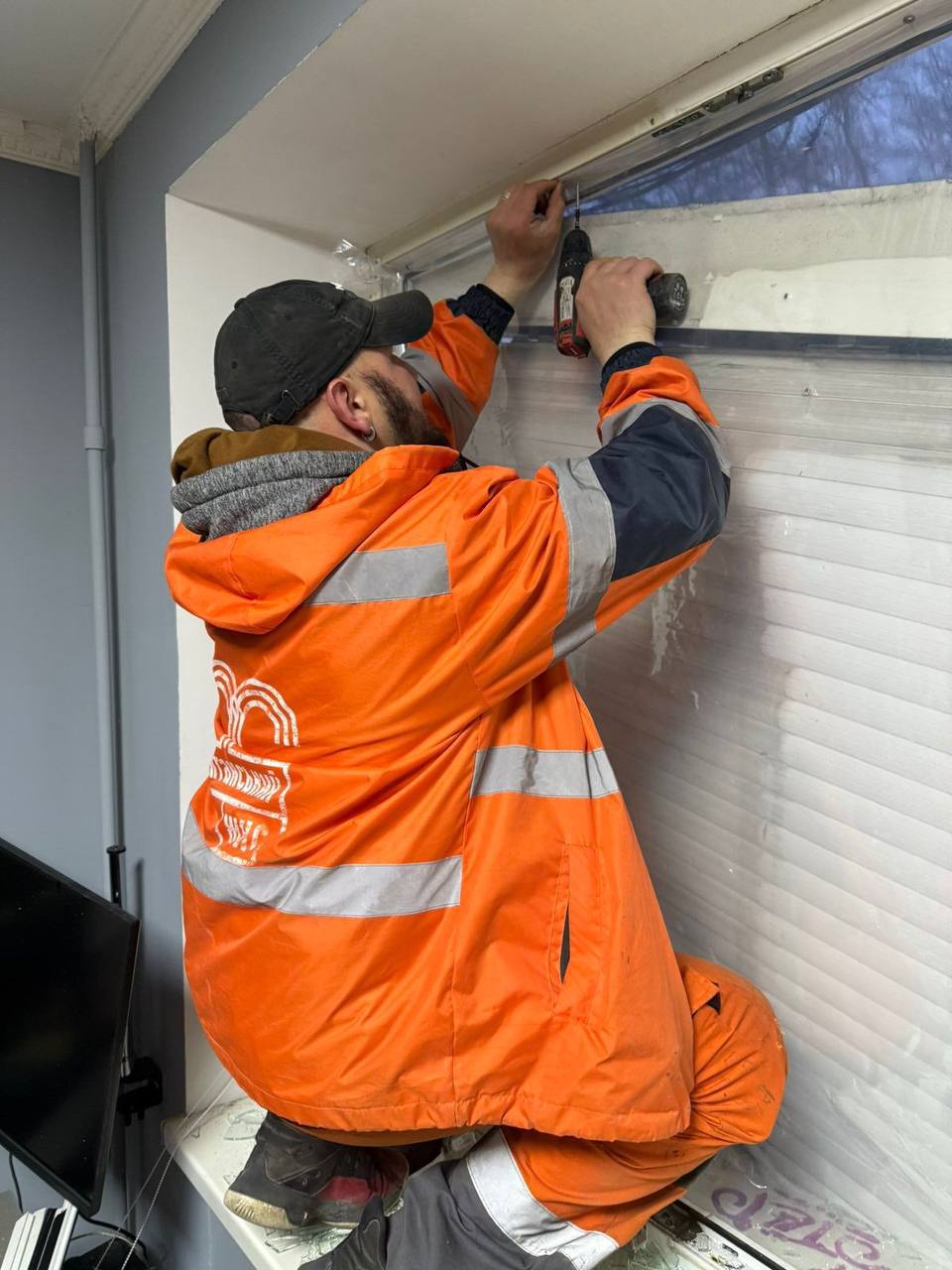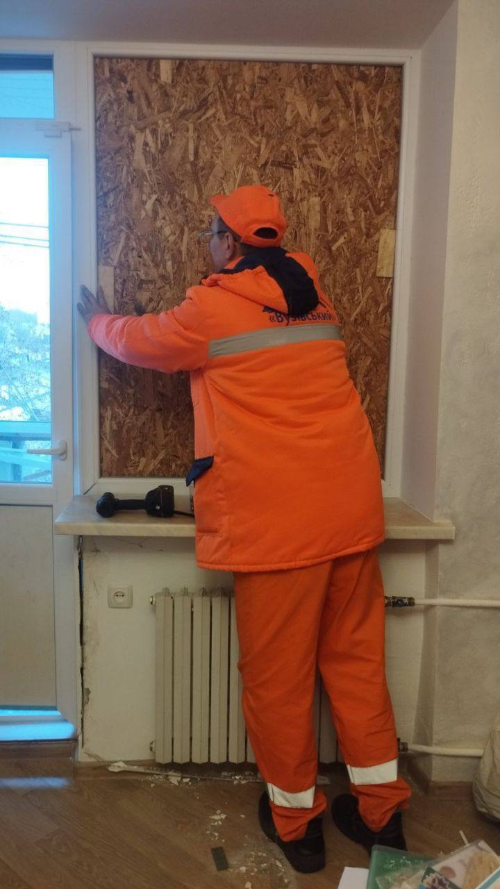 Комунальники вже закрили понад 90 віконних прорізів OSB-плитами та плівкою, розчищення територій від уламків триває.
