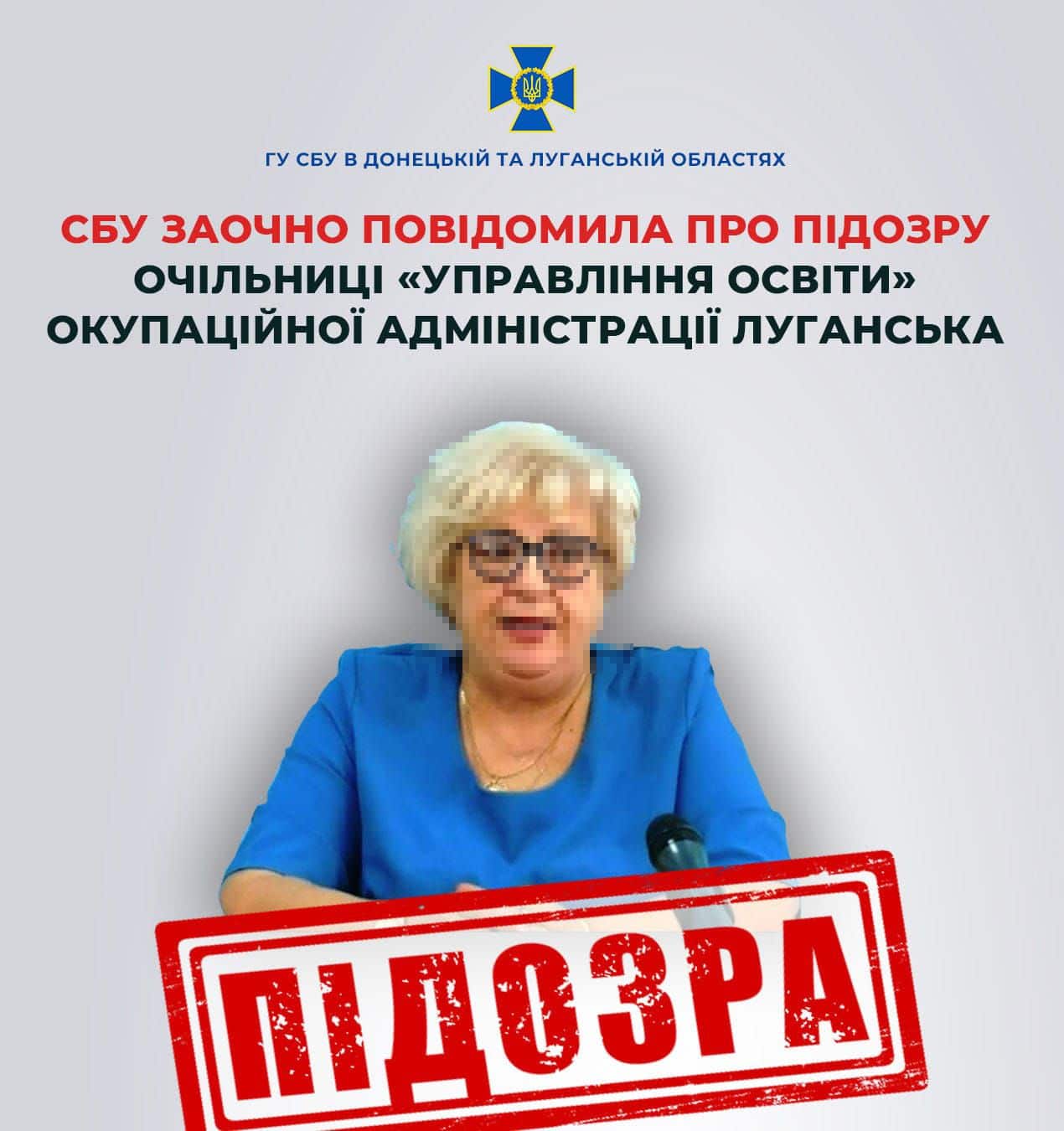 За матеріалами слідства, колишня директорка департаменту освіти Луганської міської ради з 2014 року співпрацює з ворогом і забезпечує підпорядкування освітнього процесу цілям рф у навчальних закладах обласного центру.