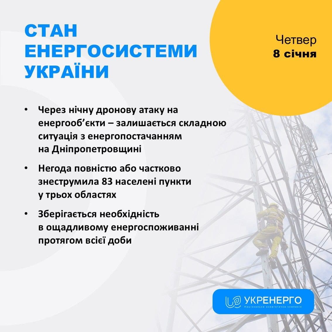 ☝️ Нагадаємо, увечері 7 січня російські війська завдали чергового удару по енергетичній інфраструктурі України, внаслідок чого Дніпропетровська та Запорізька області були майже повністю знеструмлені.