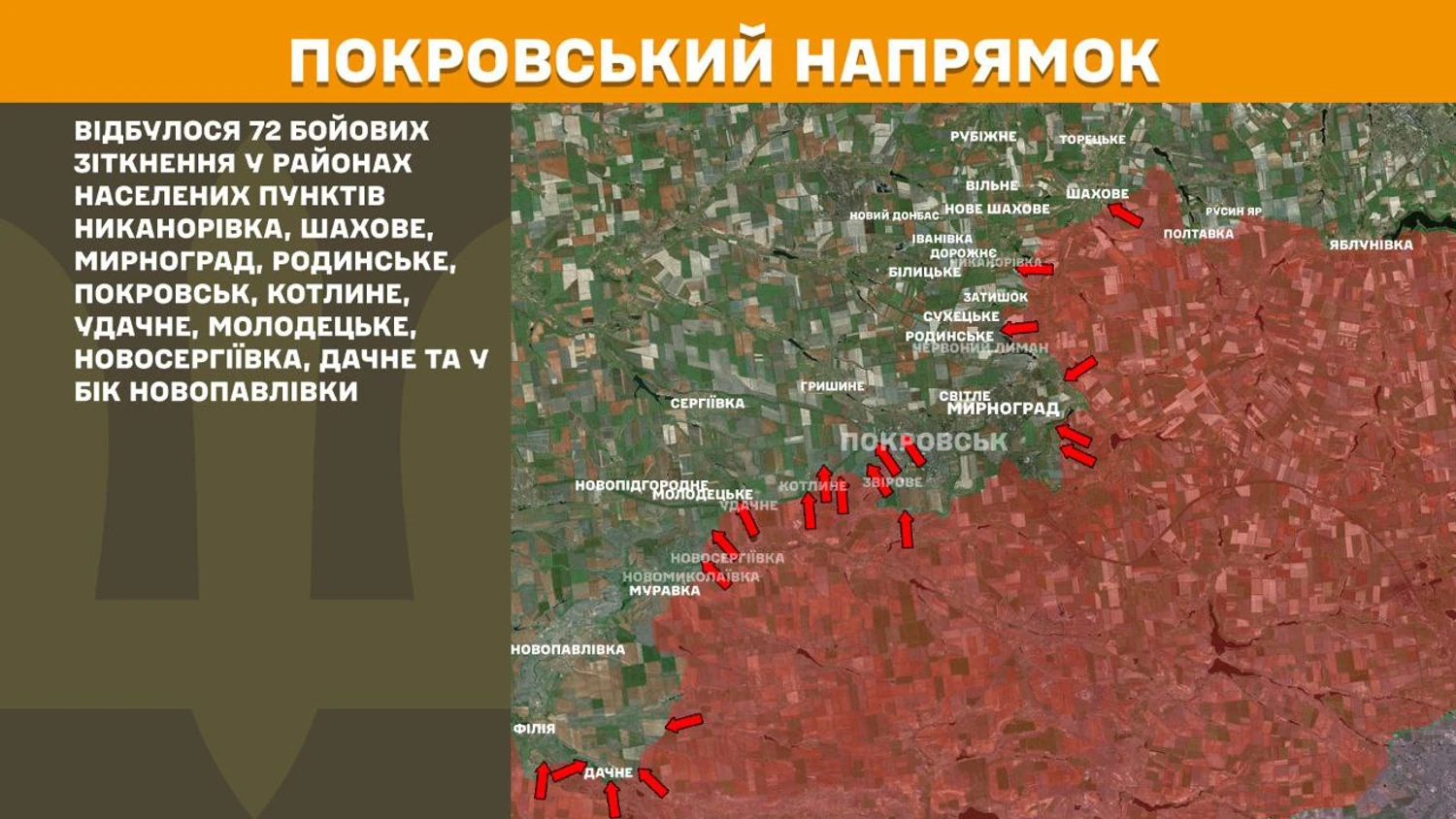 На Покровському напрямку відбулося 72 бойових зіткнення у районах населених пунктів Никанорівка, Шахове, Мирноград, Родинське, Покровськ, Котлине, Удачне, Молодецьке, Новосергіївка, Дачне та у бік Новопавлівки.