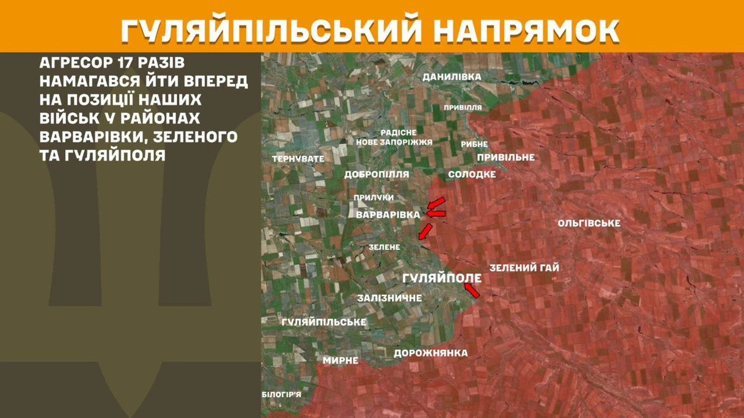На Гуляйпільському напрямку агресор 17 разів намагався йти вперед на позиції наших військ у районах Варварівки, Зеленого та Гуляйполя.
